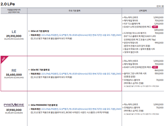 아래는 QM6의 신차 가격표입니다.QM6의 신차 가격은 LE 28810만원, RE 3314만 원, 프리미어 3742만 원입니다.
