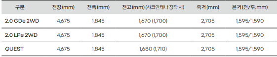 QM6 퀘스트의 크기는 전장 4675, 전폭 1845, 전고 1670, 축거 2705mm입니다.
