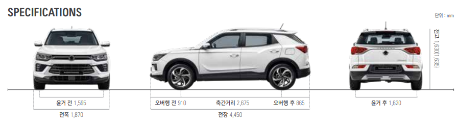 코란도의 크기는 전장 4450, 전폭 1870, 전고 1630, 축거 2675mm입니다.