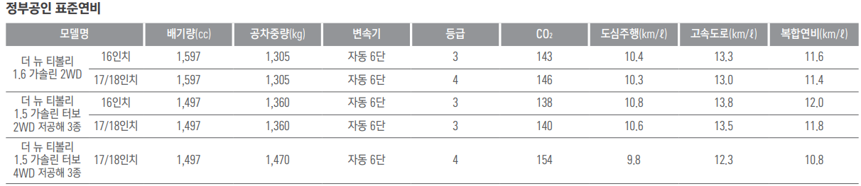 연비도 함께 알아보겠습니다. 아래는 티볼리의 연비표입니다.