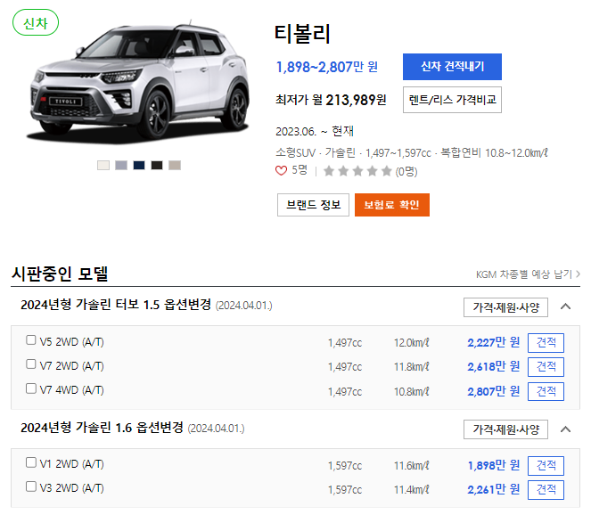 👇👇👇 티볼리 경쟁차량 신차 정보 👇👇👇