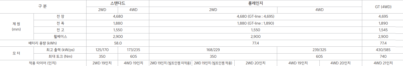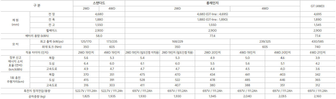 아래는 EV6의 제원표입니다. 차량의 성능에 대해서 상세하게 알아보도록 하겠습니다.