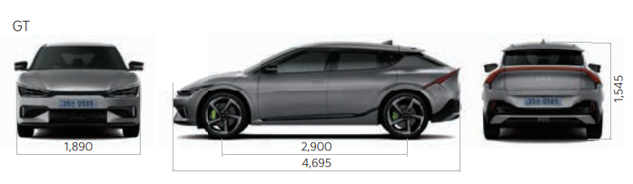 EV6 GT의 크기는 전장 4695, 전폭 1890, 전고 1545, 축거 2900mm입니다.