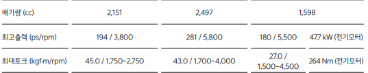 쏘렌토 하이브리드 성능 제원표