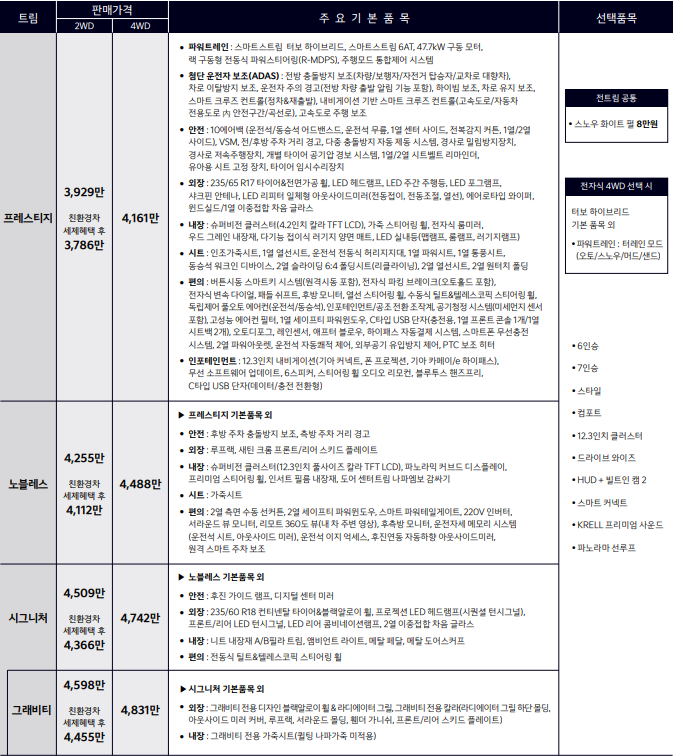 아래는 쏘렌토 하이브리드의 신차 가격표입니다.쏘렌토 하이브리드의 신차 가격은 프레스티지 3929만원, 노블레스 4255만 원, 시그니처 4509만 원입니다.