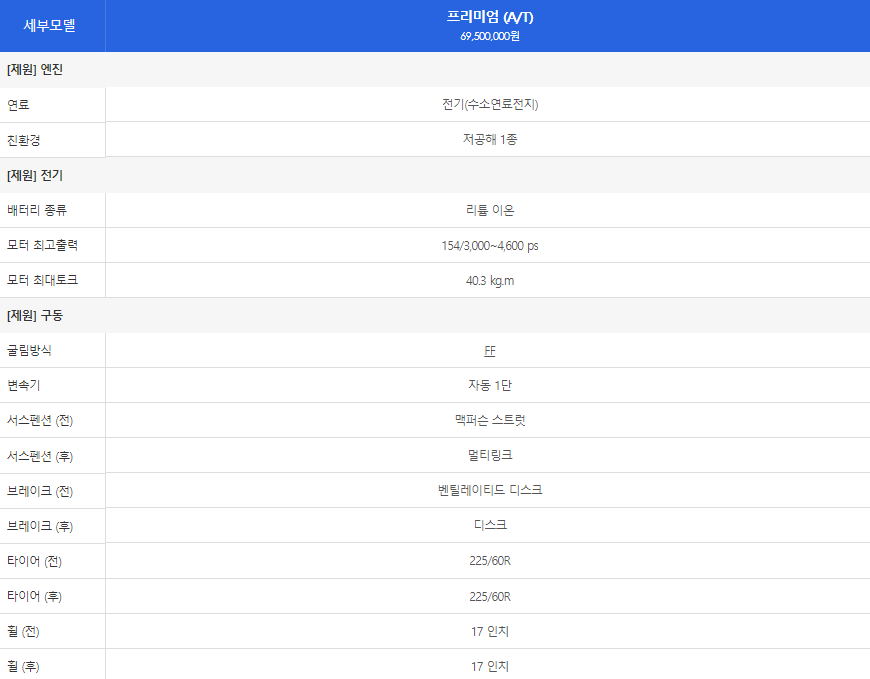 아래는 넥쏘의 제원표입니다. 차량의 성능에 대해서 상세하게 알아보도록 하겠습니다.