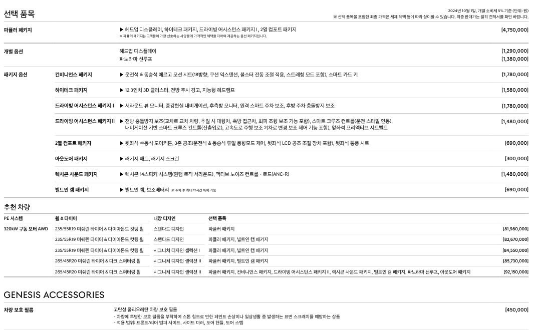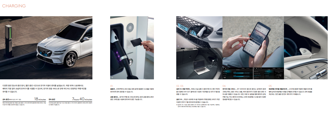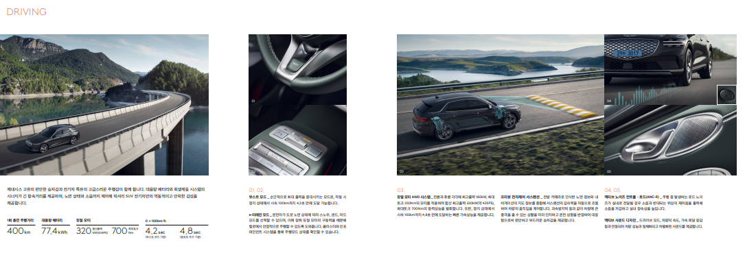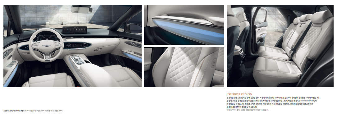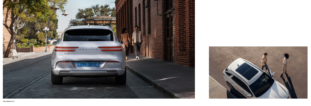 - 럭셔리 디자인: 제네시스 특유의 우아하고 스포티한 디자인이 돋보이며, 전기차 특유의 미래지향적인 요소가 더해져 세련된 외관을 자랑합니다.
