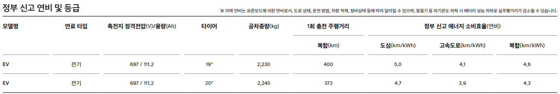 연비도 함께 알아보겠습니다. 아래는 gv70 전기차의 연비표입니다.