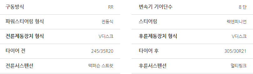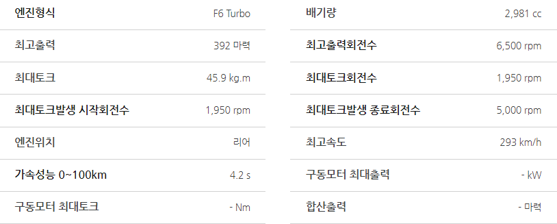 아래는 포르쉐 911의 제원표입니다. 차량의 성능에 대해서 상세하게 알아보도록 하겠습니다.
