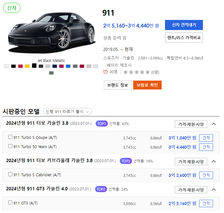 아래는 포르쉐 911의 신차 가격표입니다. 포르쉐 911의 신차 가격은 2억 5160 ~ 3억 4440만 원입니다.