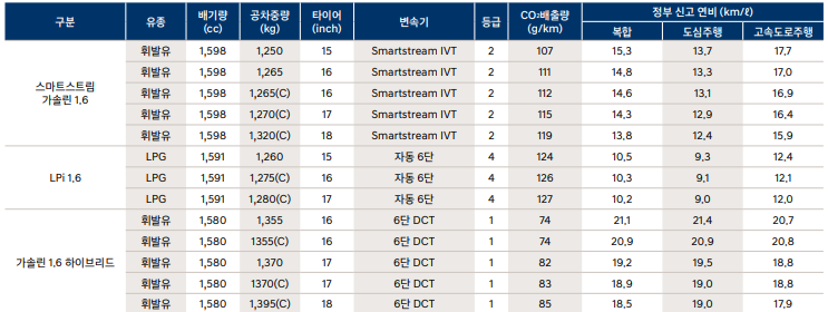 아반떼 연비 제원표
