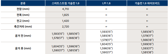 아반떼 성능 제원표