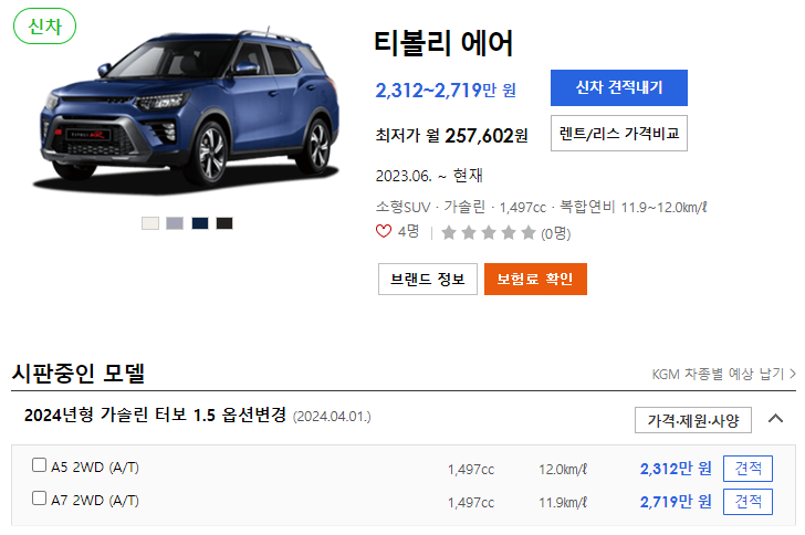 티볼리 에어의 신차 가격은 2312 ~ 2719 만원입니다.
