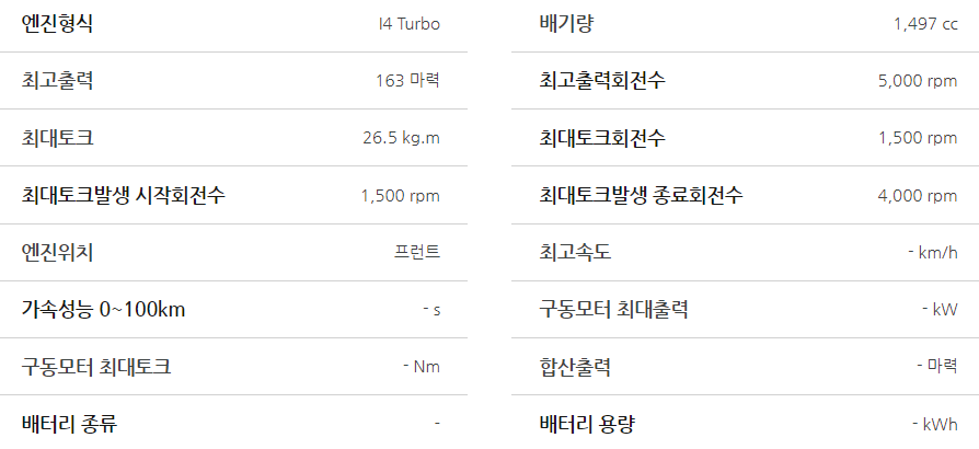 - 가솔린 터보 엔진: 1.5L 가솔린 터보 엔진을 탑재하여 힘있는 주행 성능을 제공합니다.