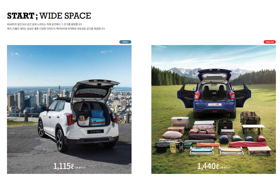 - 넓은 적재 공간: 동급 SUV 대비 넓은 적재 공간을 자랑하여 캠핑, 낚시 등 레저 활동에 적합합니다.
