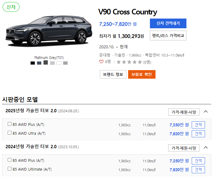 아래는 볼보 v90 크로스컨트리의 신차 가격표입니다. 볼보 v90 크로스 컨트리의 신차 가격은 7250 ~ 7820 만원입니다.
