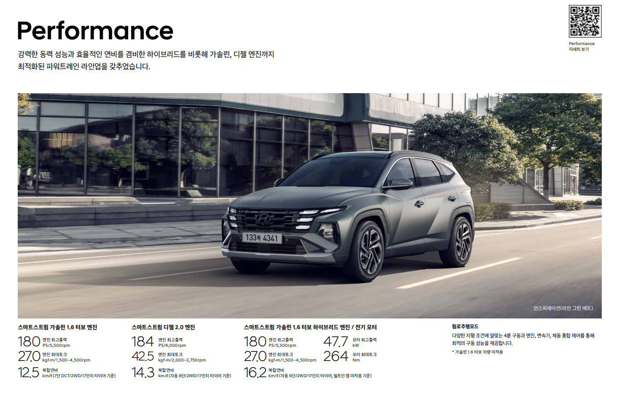 오늘은 2024년형 투싼의 성능 제원과 크기, 연비와 디자인 등에 대해 알아보도록 하겠습니다. 글아래에 2024년형 투싼의 카탈로그와 가격표 파일을 첨부해 두었으니, 파일을 다운로드하여 보다 자세한 정보를 확인하세요.