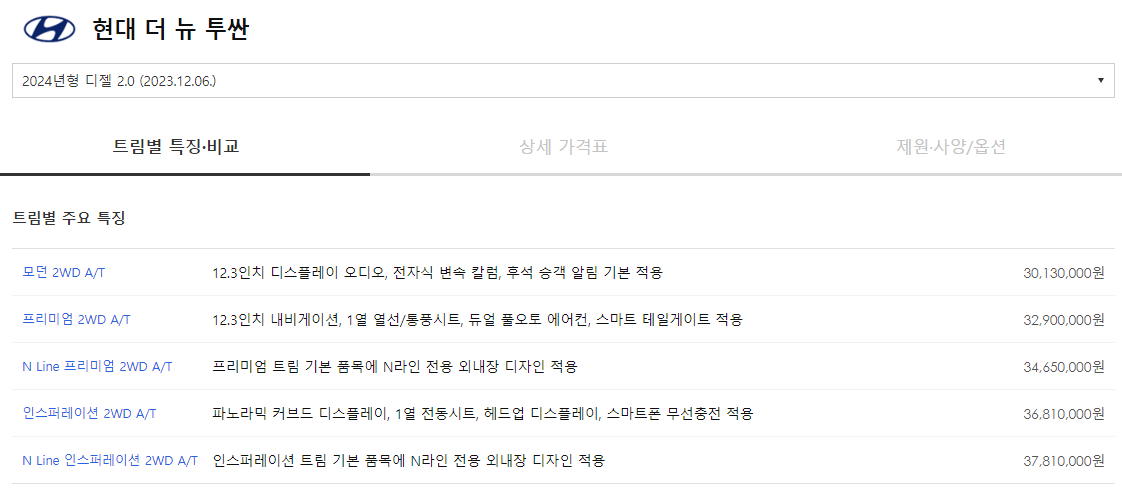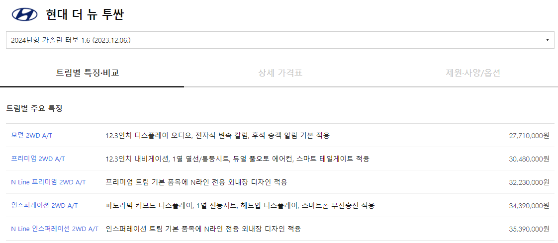2024년형 투싼 가격표를 총정리합니다. 최신 기준으로 투싼 가격이 얼마인지, 그리고 차량 제원은 어떻게 되는지 간략하게 알아보겠습니다.