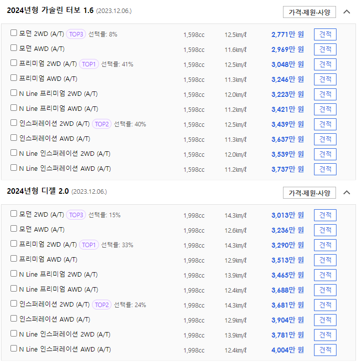 아래는 투싼의 신차 가격표입니다. 투싼의 신차 가격은 2771 ~ 4004만 원입니다.