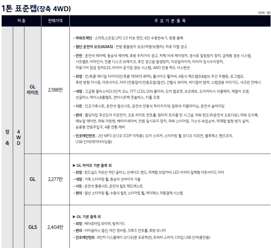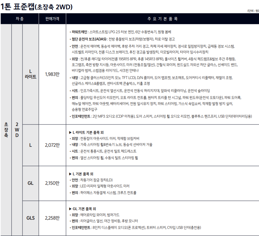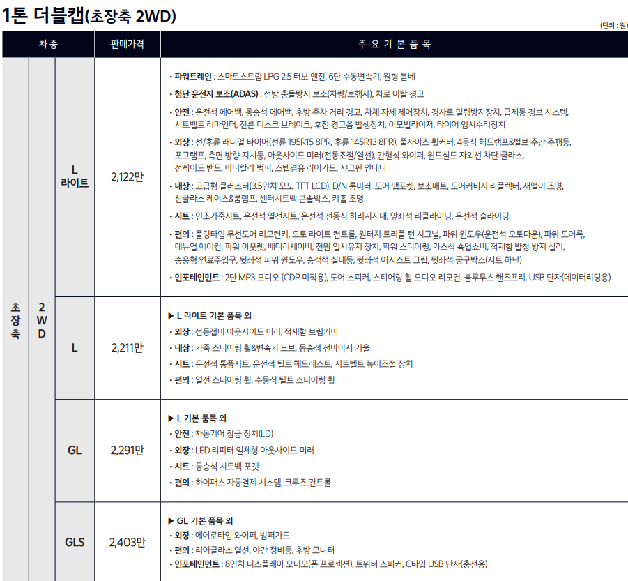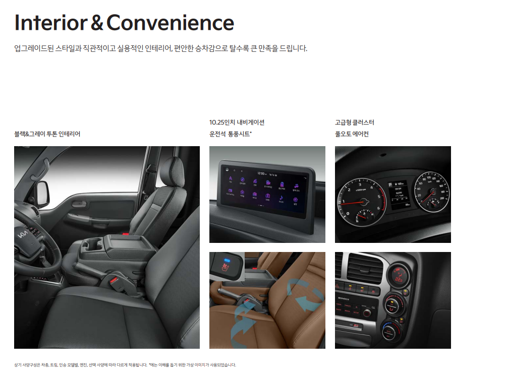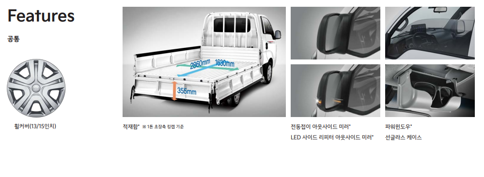 - 다양한 모델 라인업: 1톤, 1.25톤 등 다양한 적재중량과 캡, 축거, 구동 방식 등을 선택할 수 있어 용도에 맞는 모델을 선택할 수 있습니다.