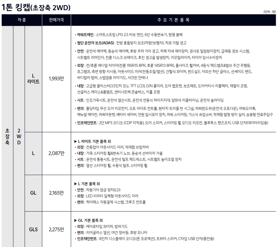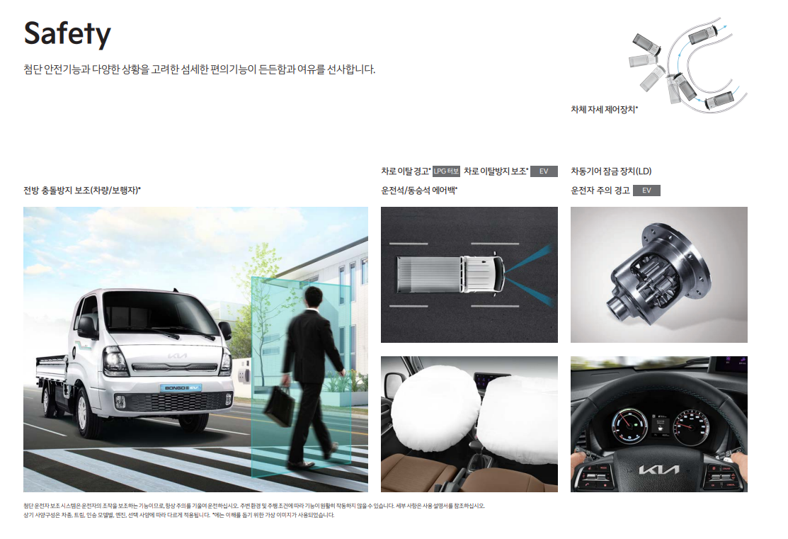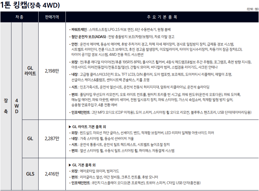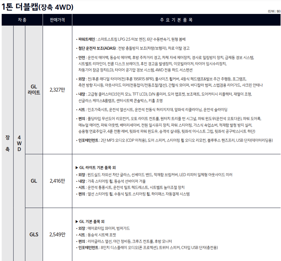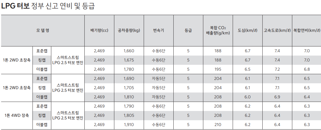 - 다양한 모델 라인업: 1톤, 1.25톤 등 다양한 적재중량과 캡, 축거, 구동 방식 등을 선택할 수 있어 용도에 맞는 모델을 선택할 수 있습니다.