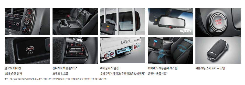 첨단 및 편의 사양: 최근 출시되는 봉고 3에는 후방 카메라, 후방 주차 보조 시스템, 내비게이션 등 다양한 첨단 및 편의 사양이 적용되어 운전의 편의성을 높였습니다.