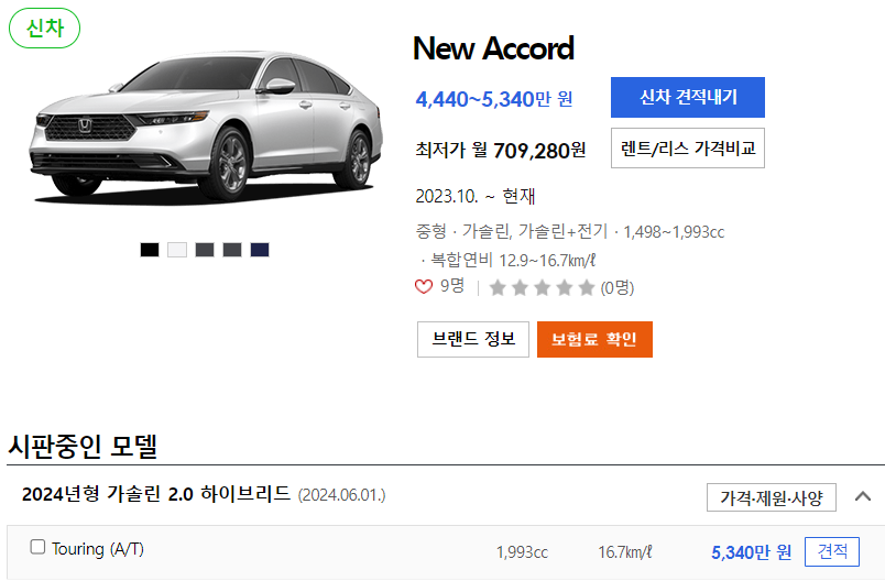 혼다 어코드 하이브리드의 신차 가격은 4,440 ~ 5,340 만원입니다.