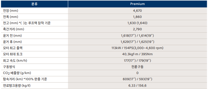 아래는 넥쏘의 제원표입니다. 차량의 성능에 대해서 상세하게 알아보도록 하겠습니다.