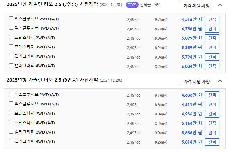 팰리세이드 가격표