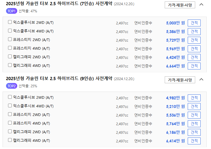 현대 팰리세이드 하이브리드 가격표(25년 신형)