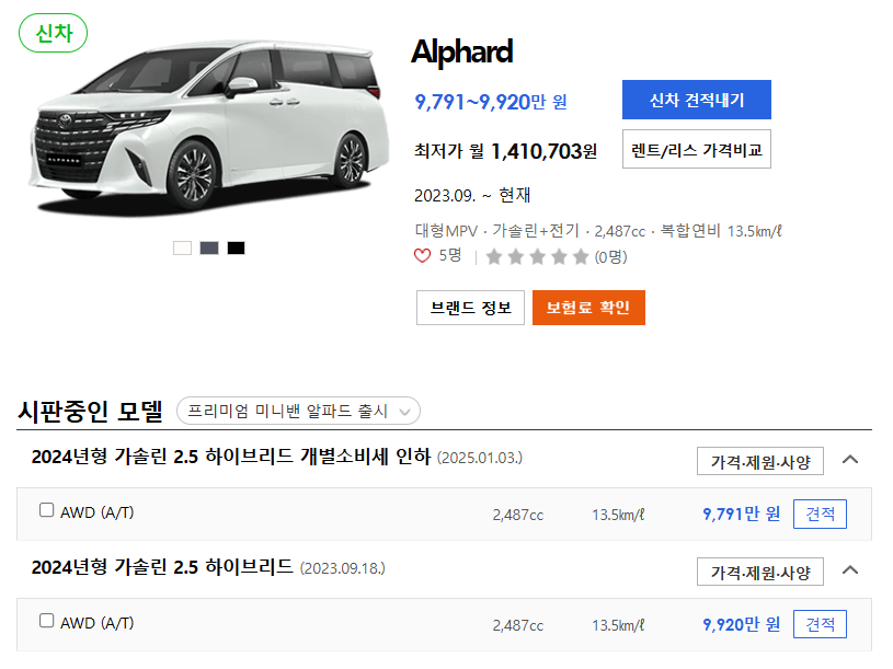 👇👇👇 토요타 알파드 경쟁차량 신차 정보 👇👇👇
