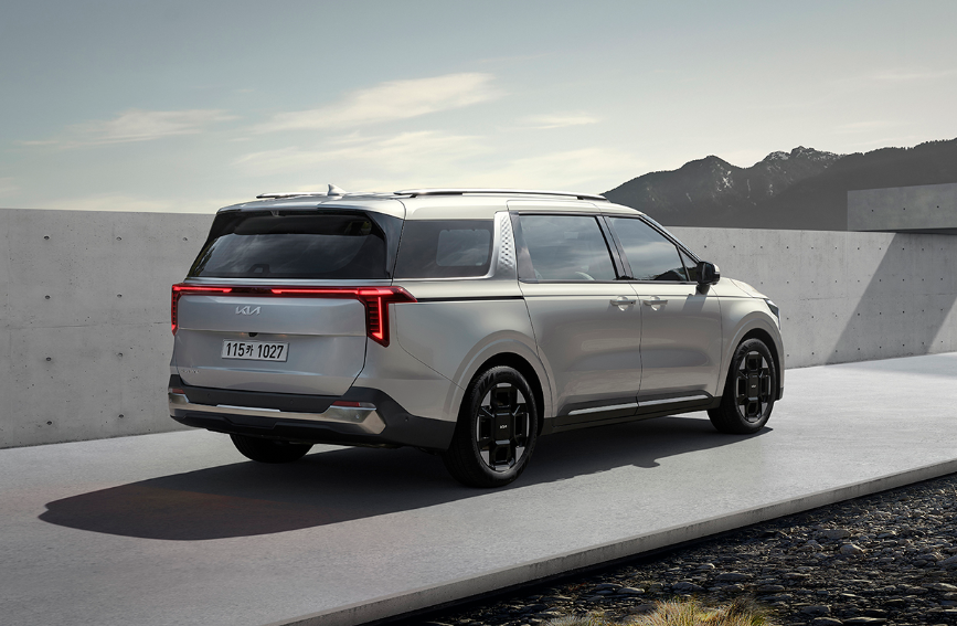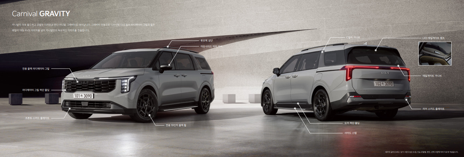 카니발 하이브리드는 기존 카니볼의 볼륨감 있는 디자인을 유지하면서도 하이브리드 모델만의 세련된 디테일을 더했습니다. 특히, 전면부의 하이브리드 전용 그릴과 범퍼 디자인이 차별화된 외모를 연출합니다.