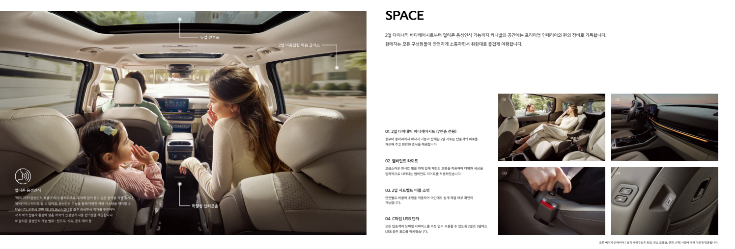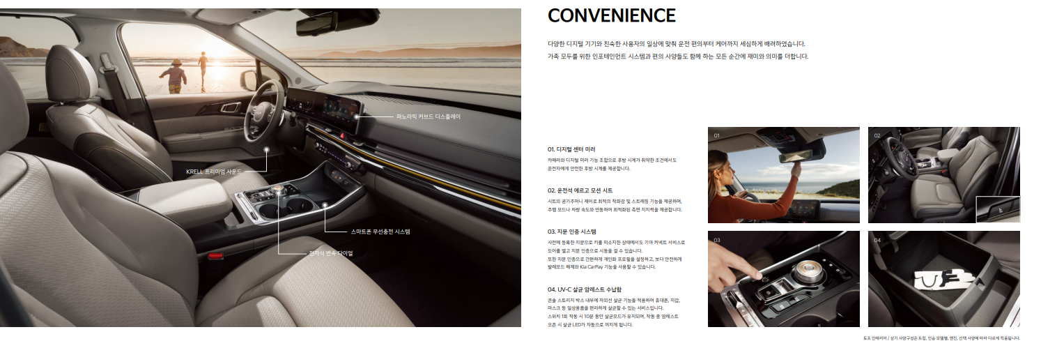 - 넓고 편안한 실내 공간: 카니발의 가장 큰 장점인 넓고 다양하게 변형 가능한 실내 공간을 그대로 유지하여 가족 여행이나 레저 활동에 적합합니다.