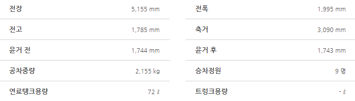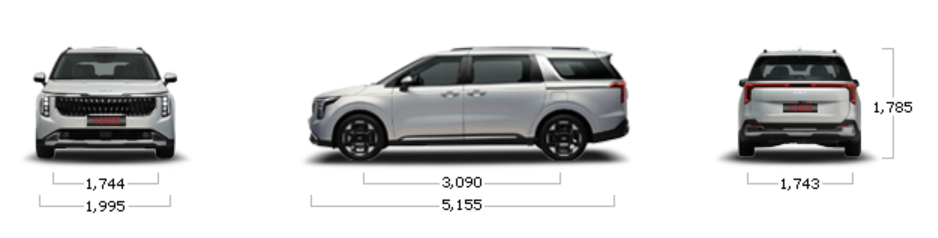 카니발 하이브리드의 크기는 전장 5155mm, 전폭 1995mm, 전고 1785mm, 축거 3090mm입니다.