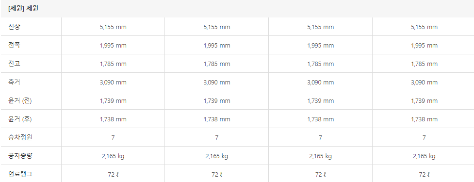 아래는 카니발 하이브리드의 제원표입니다. 차량의 성능에 대해서 상세하게 알아보도록 하겠습니다.