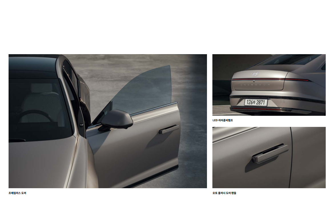 고급스러운 디자인: 세련되고 고급스러운 외관 디자인은 그랜저의 가장 큰 특징 중 하나입니다. 넓은 크롬 라디에이터 그릴과 날렵한 헤드램프는 강렬한 인상을 주며, 측면과 후면 디자인은 안정감과 품격을 더합니다.