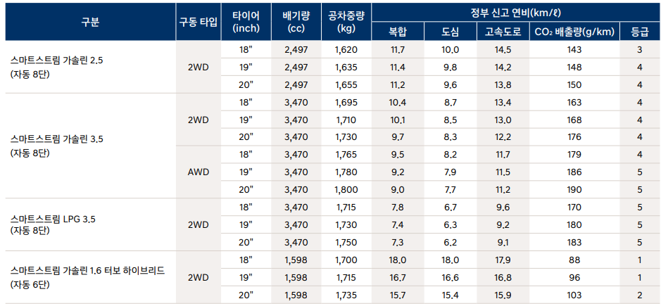 그랜저 연비 제원표