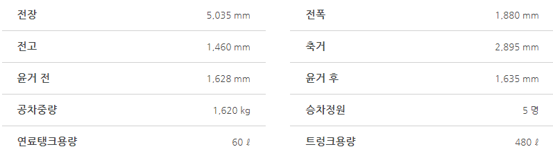 아래는 그랜저의 제원표입니다. 차량의 성능에 대해서 상세하게 알아보도록 하겠습니다.