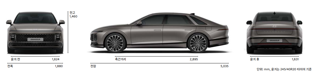 그랜저의 크기는 전장 5035mm, 전폭 1880mm, 전고 1460mm, 축거 2895mm입니다.