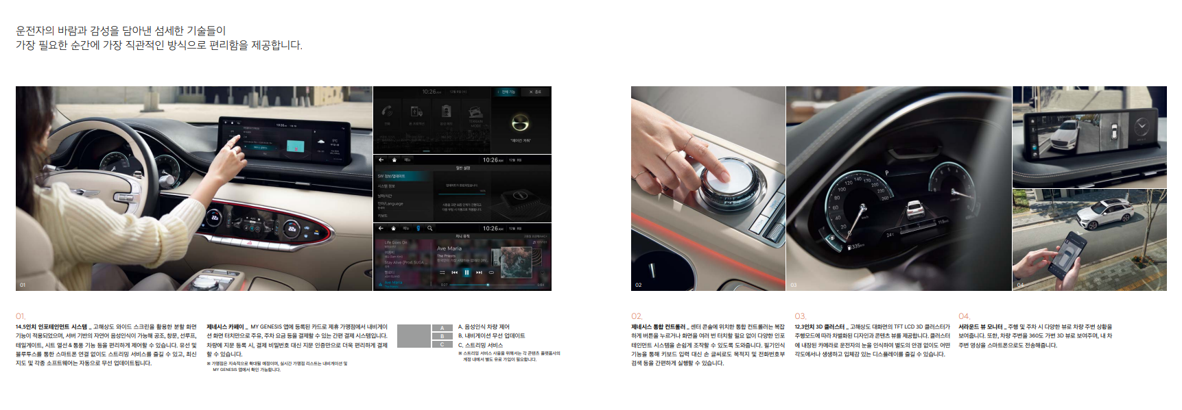 GV70의 실내는 운전자에게 집중된 레이아웃으로 설계되어, 운전의 즐거움을 더합니다. 고급 소재와 정교한 마감으로 럭셔리한 분위기를 연출하며, 첨단 기술이 적용된 다양한 편의 기능을 통해 편리한 운전을 지원합니다.