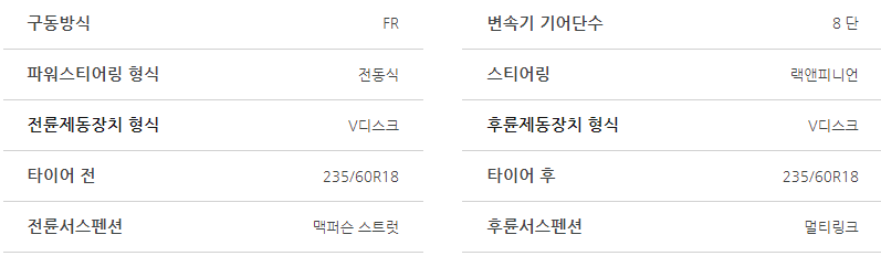 아래는 제네시스 GV70의 제원표입니다. 차량의 성능에 대해서 상세하게 알아보도록 하겠습니다.