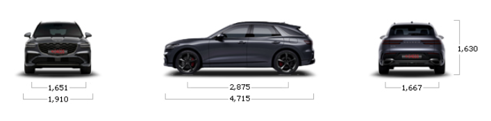 제네시스 GV70의 크기는 전장 4715mm, 전폭 1910mm, 전고 1630mm, 축거 2875mm입니다.