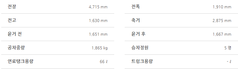 - 안전 기능: 전방 충돌 방지 보조, 차로 이탈 방지 보조, 스마트 크루즈 컨트롤 등