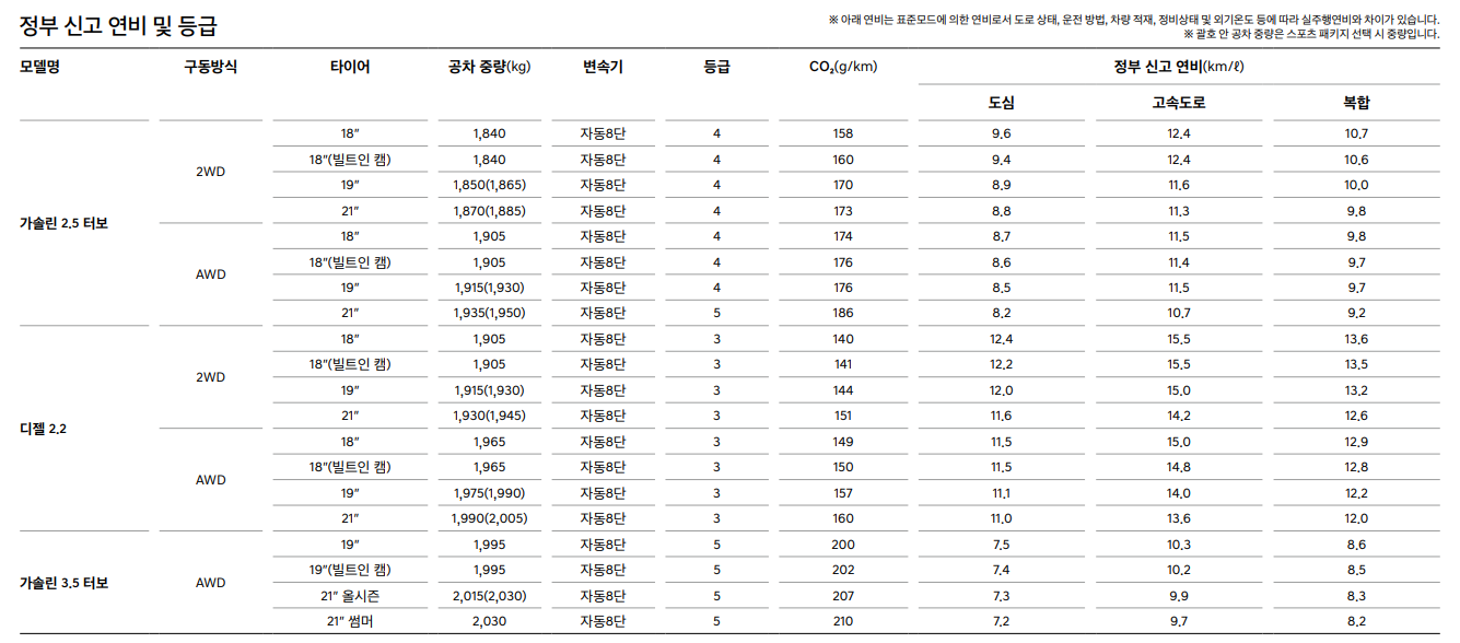 연비도 함께 알아보겠습니다. 아래는 제네시스 GV70의 연비표입니다.