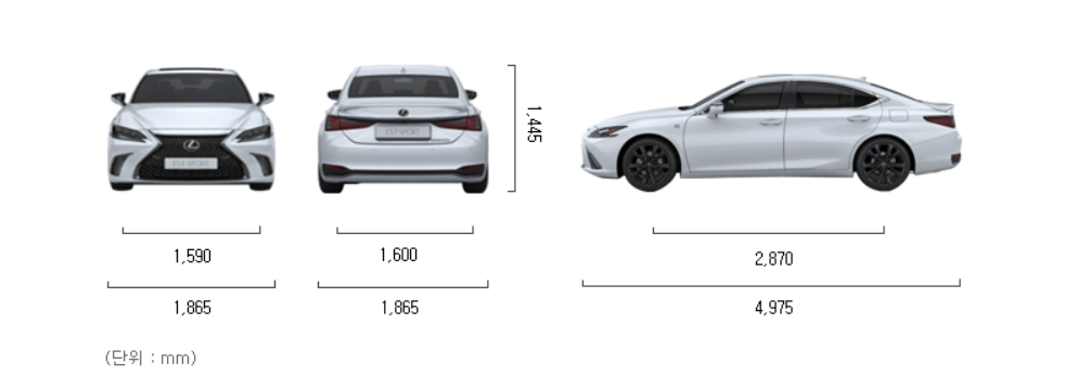es300h의 크기는 전장 4975mm, 전폭 1865mm, 전고 1445mm이며, 축거가 2870mm입니다.