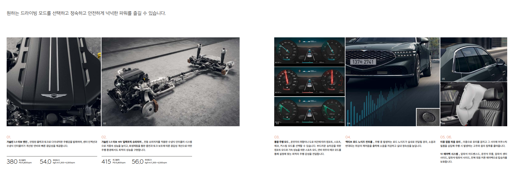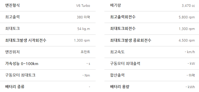 - 엔진: V6 3.5리터 가솔린 터보 엔진을 기본으로, 48V 마일드 하이브리드 시스템이 적용된 모델도 선택할 수 있습니다.