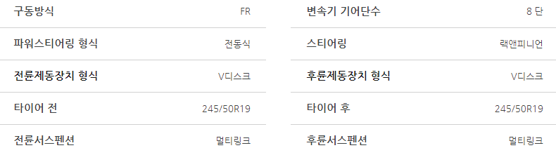 - 변속기: 8단 자동변속기가 탑재되어 부드러운 변속감을 제공합니다.