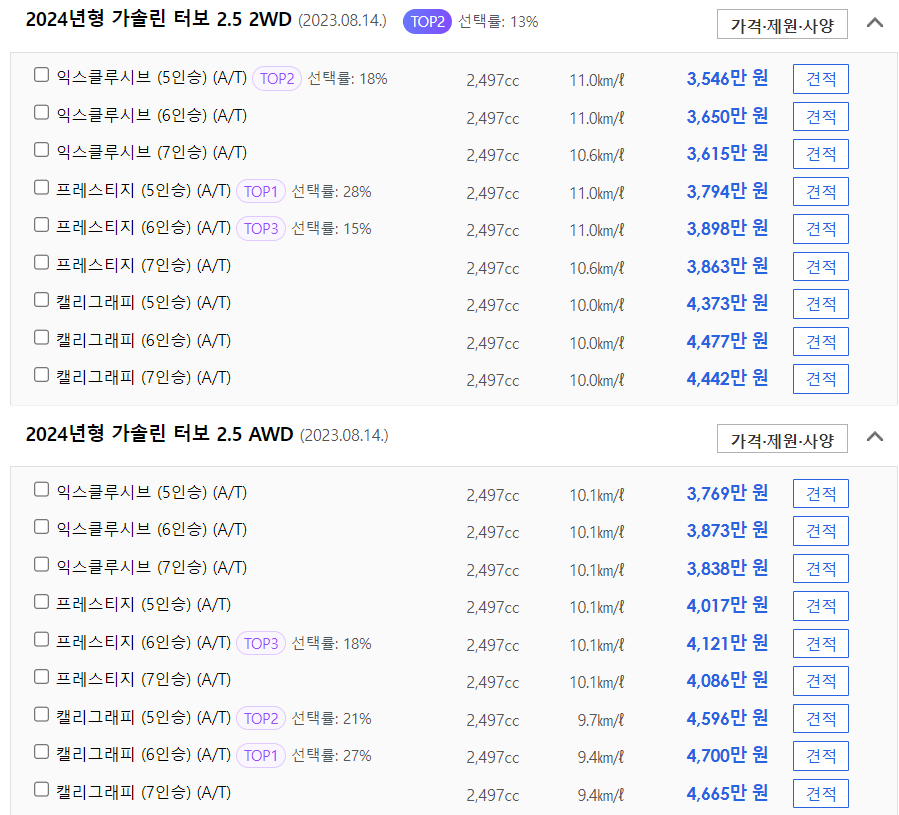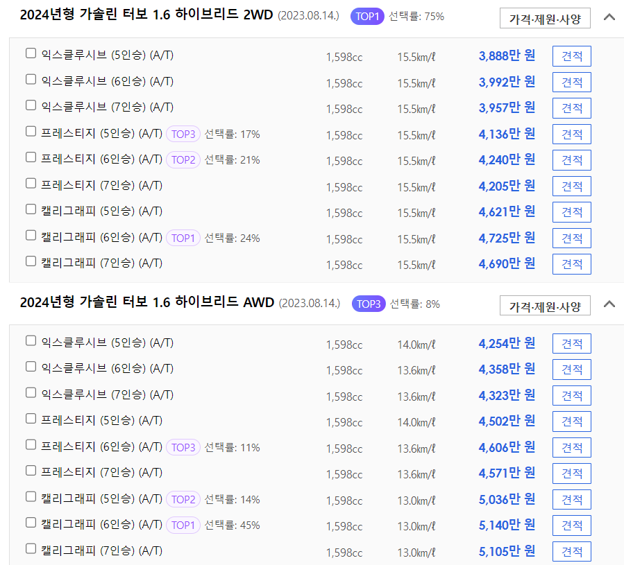 👇👇👇싼타페 경쟁차량 신차 정보👇👇👇