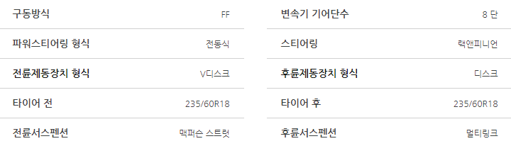 - 변속기: 대부분의 모델에 8단 자동변속기가 탑재되어 부드러운 변속감을 제공합니다.