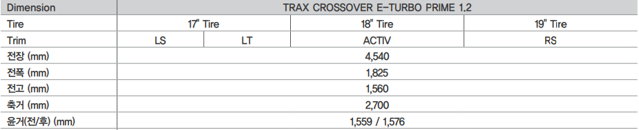 아래는 트랙스 크로스오버의 제원표입니다. 차량의 성능에 대해서 상세하게 알아보도록 하겠습니다.